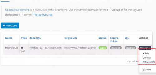 7、创建好的Zone后,你就可以在Zone中进行管理了,你可以重新编辑Zone进行设置,也可以使用Purge来清除缓存。