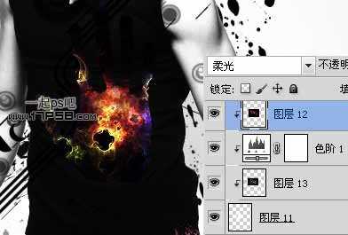 一个素材层图层模式正常,并添加了一个色阶调整层加亮,另一个素材图层模式柔光,都与手掌层(图层11)形成剪贴蒙版。
