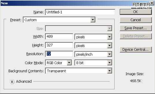1、在Photoshop中创建一个489×324像素大小的新文档,如果照片比较大,你也可以创建一个大一些的文档。