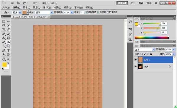 5、选择修复画笔工具,然后用油漆桶工具进行填充图案,直到没有缝隙为止,然后按住CRL+A键选择,按下delete键删除选区内图像,然后选择修复画笔工具,选择图案为源,然后勾选用于所有的图层,如图