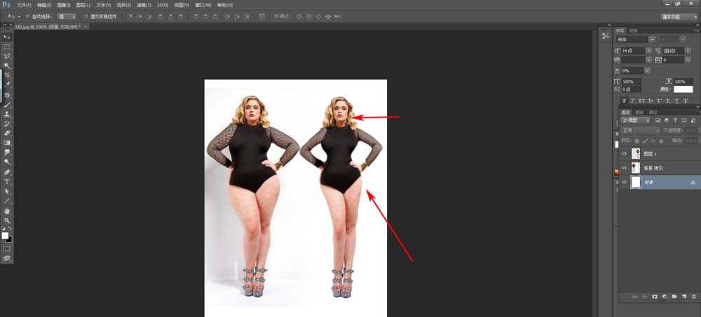 1、我们拿到一张需要瘦身的模特照片的时候,首先要学会观察,观察的目的是为了确定这个模特哪里需要瘦身,如何瘦身!这是最基本的问题,我们还要考虑模特本身突出的美的特点也要保留。一般来说人容易产生赘肉的部分无非腰腹,脖颈,大腿根部,小腿肚,手臂等,这些部位是我们重点要操作的部位。