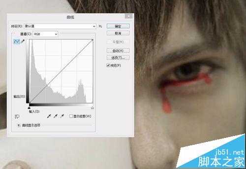 4、做出眼睛流血的效果。用选区工具选出血液的形状 然后选区羽化10-15 具体根据图片而定,用色彩平衡工具吧选区调成红色 再用曲线工具调出点明暗效果,用笔刷选一个比血液暗点的红色画出点暗部 再选一亮色画点高光
