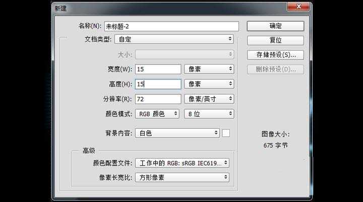 4、新建画布15*15px,分辨率72px,如下图;接下来,设置前、背景色为黑白色,按G键调出渐变工具,选择线性渐变,从上往下拉,如下图;接下来,执行:编辑-定义图案,如下图;