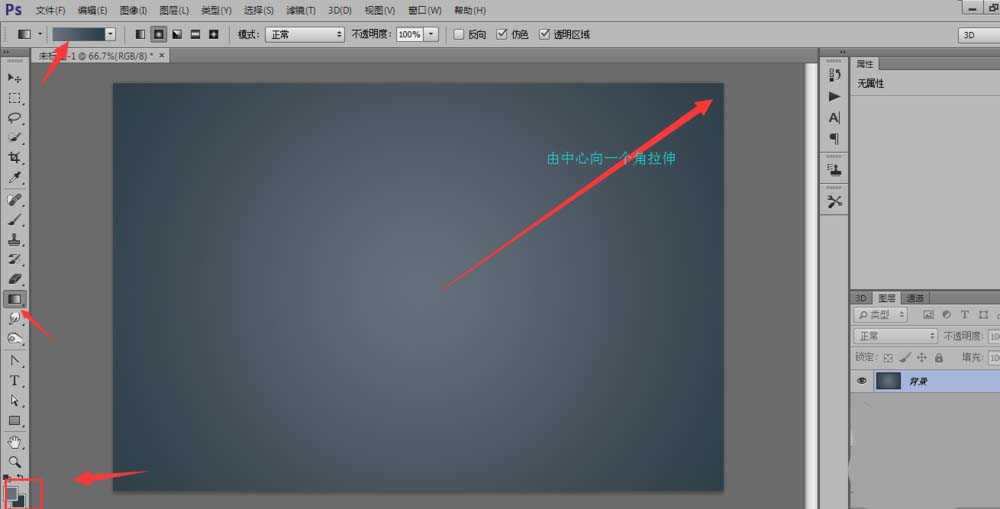 2、设置前景跟背景色再选择渐变工具由中心向一角拉伸填充背景图层如图所示: