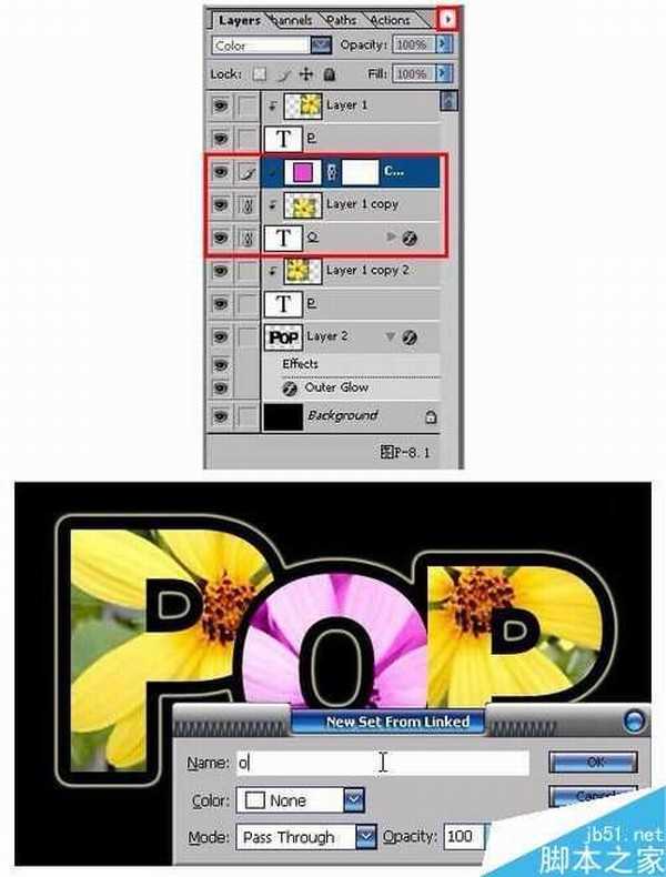 8、将O图层与它上面的两个图层进行链接,再点击图层面板上方的三角形按钮,在弹出的菜单中选择“由链接图层新建组”,命名为O图层组。
