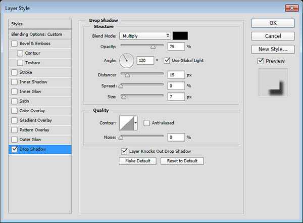 9、双击Stroke 2 图层,在图层样式面板中勾选投影,并设置以下数值: 距离:15;大小:7。