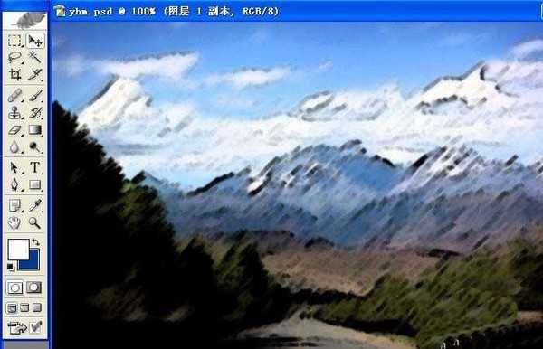 6、【阴影线】滤镜确定后,可看到风景图片添加上滤镜的效果了,如下图所示。一张图片在用滤镜前,最好复制一个副本在图层中,这样好对比看效果。