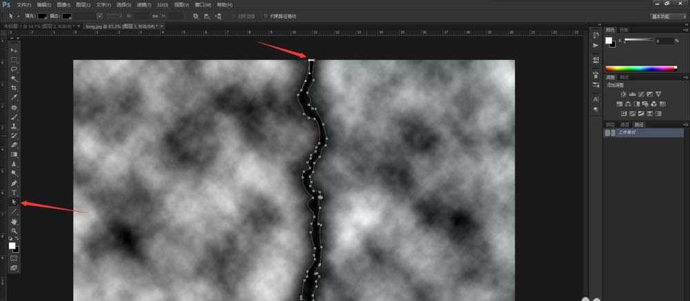 8、完成主干部分后,接下来制作分枝部分。重复2-4步骤,完成对中间黑色带选取后,点击“路径”转换到路径面板,点击“从选区生成工作路径”。我们用画笔描边路径的方法形成闪电。