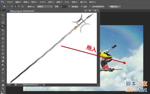 4、导入方天画戟,拖入到天空素材后,ctrl+T调整大小,移动到手上,使用橡皮擦工具修饰。