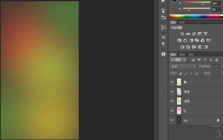 3、再继续创建新的图层,涂抹上另外几种颜色。色彩的分布随自己的喜好。但注意每一种颜色最好新建一个图层,重命名不同的图层,可以方便今后修改和调整。