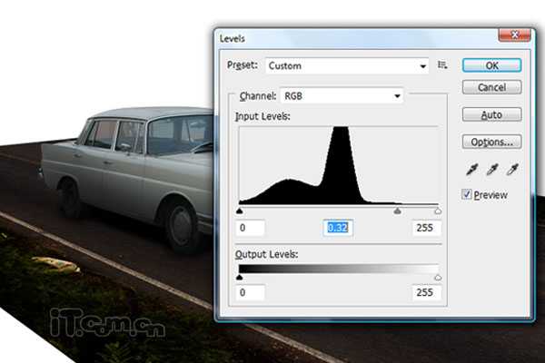 11、下面让我们调整公路的色调以配合汽车的色调。选择公路图层,按下Ctrl+L打开色阶对话框,参考下图所示的设置。