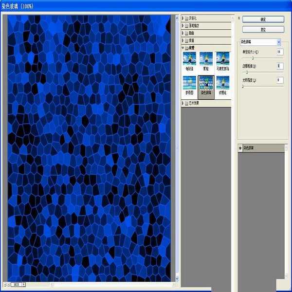 3、执行滤镜-纹理-染色玻璃命令,在弹出的对话框中设置单元格大小为14,边框粗细为3,点击确定按钮。