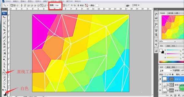5、不规则几何图形立体感增强了。继续制作吧,如图用直线工具在图上画线段,线段粗细为3px(请自己试验,如果线段粗了请把像素调小,细了则调大)。