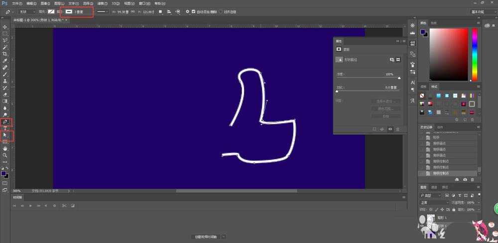 2、钢笔工具勾画手动点赞的轮廓,然后通过改变点工具直接选择工具细调轮廓