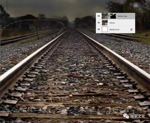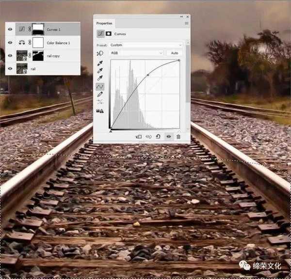 6、创建曲线调整图层,为铁路区域带来更多光线,特别是侧面和背景。在这个图层蒙版上,使用一个柔软的黑色笔刷来擦除前景,因为它远离光线。