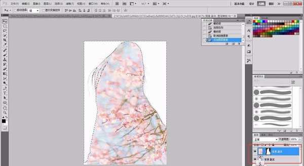 6、这时我们看的人物五官不清楚,为了使人物五官更清楚,复制人物图层, 设置前景色为黑色,背景色为白色,用画笔工具,将不需要的地方涂抹掉,留下五官就可以。