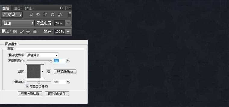 将“素材1”放置画面中,设置图层模式设置为叠加,不透明度24%,再将“素材2”设置为图层样式-图案叠