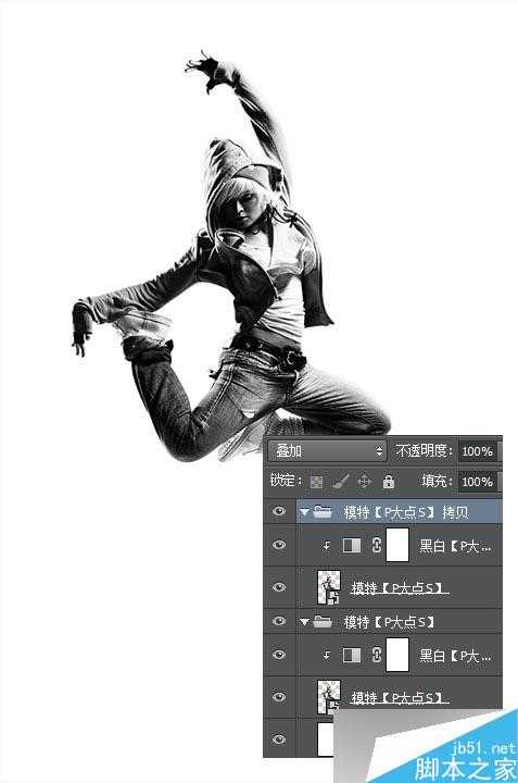 在"模特"图层上层,以剪贴蒙版的形式,创建一个"黑白"调整层,赋予模特黑白效果,选择"模特"图层和"黑白"调整层,CTRL+G,创建图层组,命名为"模特",复制一层图层组,并更改组的图层混合模式为"叠加",这样,我们就得到一个高对比度的模特了。