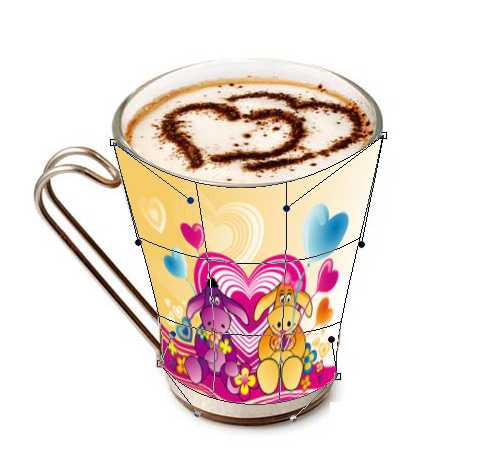 一、使用“移动工具”将卡通图像拖到咖啡文档中。按下“ctrl+t”快捷键显示定界框,在图像上单击右键,在打开的快捷菜单中选择“变形”命令,如图1所示,显示变形网格,如图2。