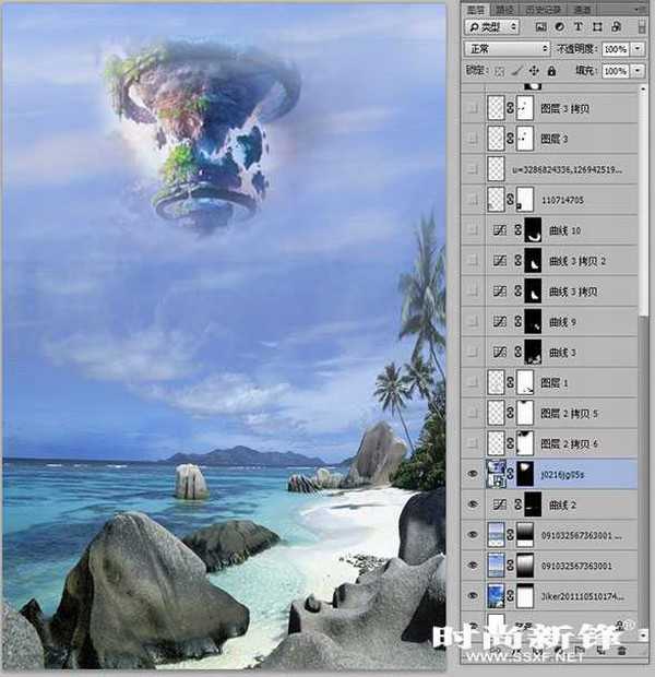 3、导入图片,制作天空之城悬浮效果。并压暗海平面交界处,使背景更具有立体感。