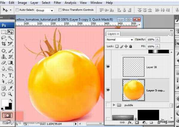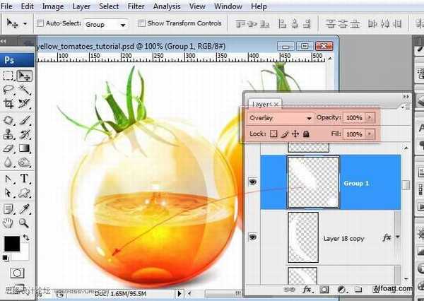 67、将左侧西红柿所有图层复制并合并复制图层,垂直旋转到新建图层,将旋转图层放在复制图层之下。