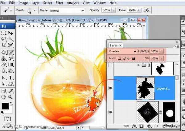 28、为了创建一个西红柿的反射色彩效果,将正常的西红柿上半部粘贴到新的图层,图层混合模式为颜色,使用柔角笔刷擦去底部和边缘。