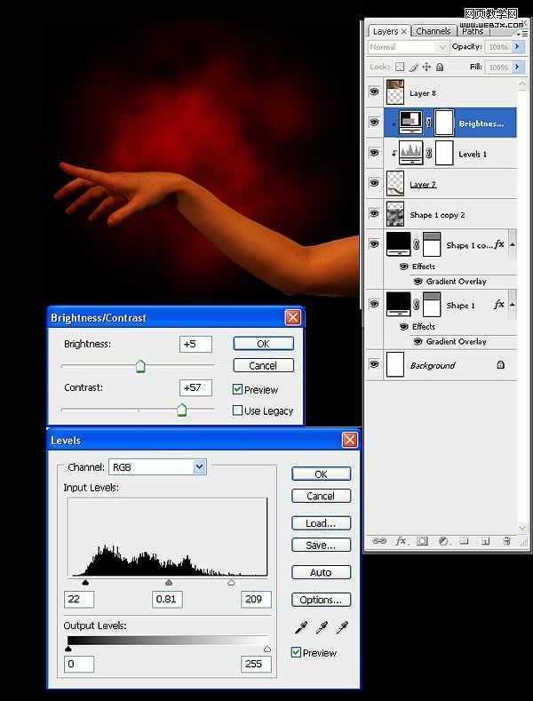 然后把扣取出来的手放到当前文档中来,然后创建亮度和对比度调整图层和色阶调整图层,调整颜色。