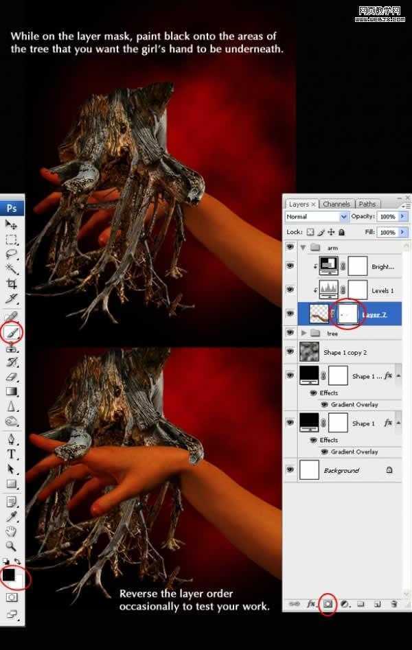 放到文档中的,然后调整次序,使树根正好覆盖住手部,怎么做呢?当然是给手图层添加蒙板了!呵呵