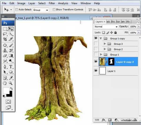 2、用钢笔把树干部分抠出来,转为选区后添加图层蒙版,如下图。