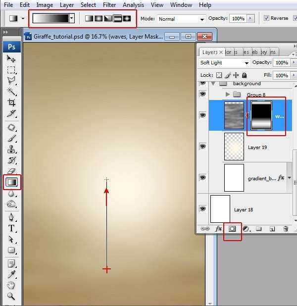 6、合并创建的所有层。 使我们的背景较轻的右半部分,光源会经指示由权利。 快速蒙版模式,选择线性“黑与白”渐变工具。 填充层,由左到右边缘梯度的文件。 左边应该成为粉红色。 使快速蒙无效。