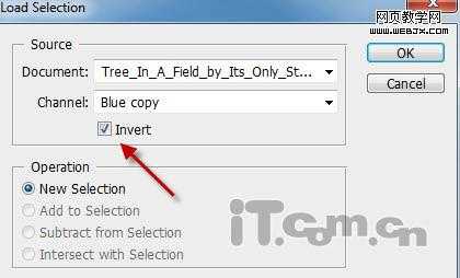 10、选择“蓝副本”通道 ,在菜单栏中打开“选择—载入选区”,在弹出的对话中选择反相,如图所示。