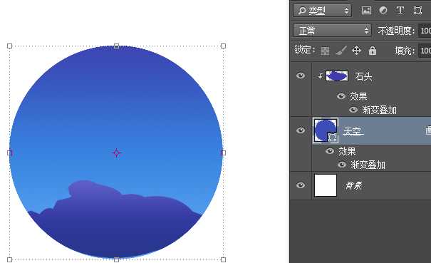 勾出来形状后,会发现石头和蓝色大圆天空几乎不能完全融合,石头边缘出界了,这时需要如下图所示按住ALT键点击两个图层分界处,上面图层前面多了个向下的小箭头就成功了
