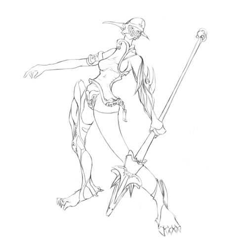 3.在粗略形象的基础上开始完善人物的细节部分。Intuos 3全新的笔尖使绘画的感觉更加接近于传统绘画。尽量完善线条的完整性,最好能呈现出一个完整的线稿。