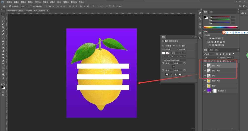 5、将柠檬图层选中,按快捷键Ctrl+J复制一层,得到一个柠檬素材的复制拷贝层,然后将原来的柠檬图层隐藏;选中矩形工具,然后在柠檬上面绘制一个长条矩形出来,设置矩形的填充颜色为变色,描边为无;然后选中这个矩形,按住辅助键shift+alt键在复制出两个长条矩形出来。