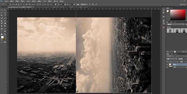 6、同样用钢笔工具做对角线框出下部分内容,按Alt添加蒙版删掉内容。此时发现天空中间有一点不和谐的地方。
