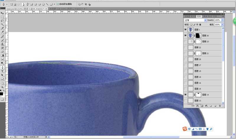 先抠图,钢笔,在原来杯子上面把色块抠粗来,大致样子