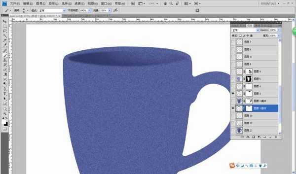 所以在这个基础上,在最上面加一个杯子图层(最开始的杯子轮廓),填一样的颜色,透明度调整,那看上去杂色效果就在杯子里面了,杯子把手也加阵营的效果,效果如图