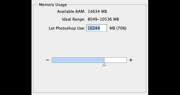 Photoshop的性能设置显示了让Photoshop使用多少内存。