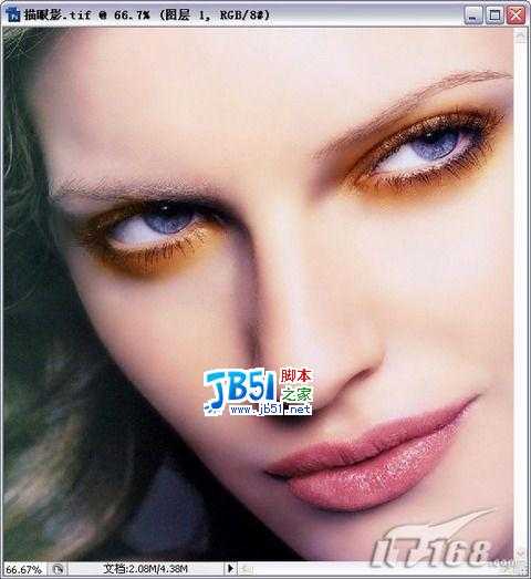 STEP1 执行【文件→打开】命令(快捷键Ctrl+O),打开素材图片:“描眼影.tif”,我们将看到整个图片如图所示。在这张图片中我们可以很明显的看到里面的女主角的照片并未涂抹五彩的“眼影”而是很一般的数码照片。