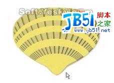 七、新建图层二,将其放置在图层一的下面,用钢笔工具,将整个扇形勾画出来,用直接选择工具调整好路径。按住ctrl不放,用鼠标左键点击路径面板上的路径,将路径转换成选区(也可按面版底部的“将径作为选区载入”图标),填充R:242G:230B:112(图六)