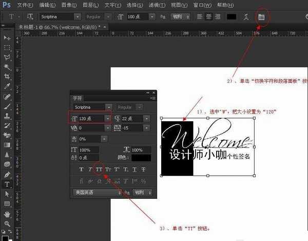 6、再选中“welcome”中的“W”,将文字工具栏设置为:文字:scriptina;文字大小:120点。