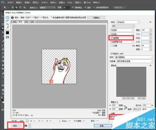8、接下来,选择顶部的“文件”—“导出”—“储存为web所有格式”,也可以按快捷键 Ctrl+Alt+Shift+S ,一定要检查是否勾选了透明度!在导出之前可以点击左下角“预览”进行查看。然后点击“储存”选择要保存的位置 “确定”!