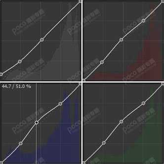 (3)色调曲线,特别要说明的是如果在基本调色面板中大幅度的调整了高光,在RGB通道中的高光部分就应当选择小幅度调整或者不调整,如果两种压暗高光的方法都用就会使画面没有质感,灰蒙蒙的一片,调整参数如图: