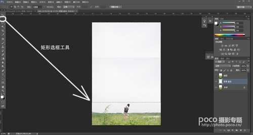 第三步:大家一定会问了这样拉动上面不就是少了么,画面当中出现了横条。由于后面的背景我本来就需要云素材覆盖掉的,所以我不想再花时间找相同的照片覆盖处理,所以直接使用矩形选框工具把它选中,大家这里要注意一点千万别选中主体人物,否则人也会同时被变形。