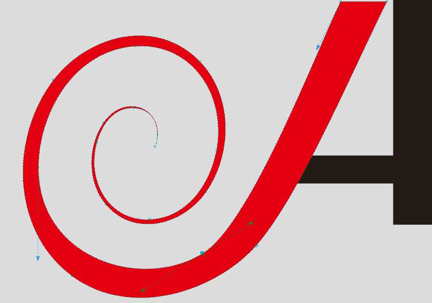⑧ 我们把曲线填充红色,放到字体上然后调节下曲线和字拼接处的锚点,把大小调节到差不多等大就行,只要把2个锚点放到字体轮廓边缘就可以了不需要细调