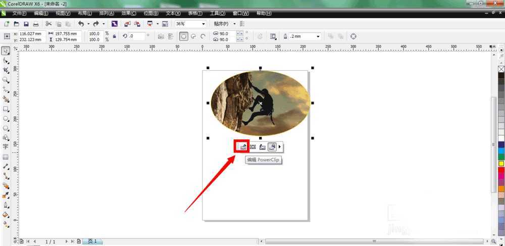4、把椭圆形移动到图片上需要裁剪的那部分的位置上,用选择工具单击选中图片,点击菜单栏里的“效果”——“图框精确裁剪”——“置于图文框内部”