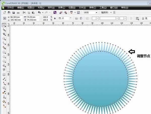 4、在属性栏中选择“拉链变形”,用标尺锁定圆形的中心点,点住鼠标往右边移,那么圆形就长出角来,再点击“平滑变形”,那么就角度会变得光滑。