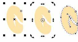 提示:当选中对象时,在对象四面出现的八个小黑方块可以调整对象大小,在选中对象的情况下再单击对象一下,就会在对象四面出现旋转方向键,这时就可以利用这些键头对对象进行旋转。假如快速连击对象,则会转换到使用"外形工具"状态下,进行对对象的外形的节点调整。