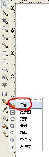 5、然后利用交互式调和工具进行调和(小白圆到自己所建的大圆,图为粉色),选中图中所示的工具,按住鼠标左键由小白圆拖动到大圆。若感觉圆调和出来不好看可根据图二所示两个属性去增加调和步数或者改变对象和颜色加速,一直调到自己满意为止。