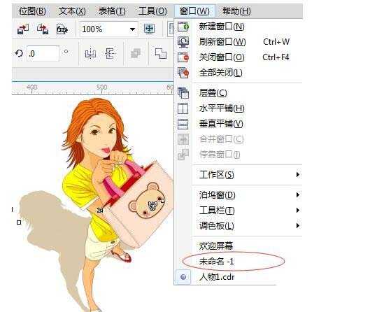2、打开素材文件“背景.cdr,使用“选择工具”选择对象后,按组合键Ctrl+C将对象复制,单击“窗口”菜单,在弹出的菜单中选择上一步新建的文档,如图所示。